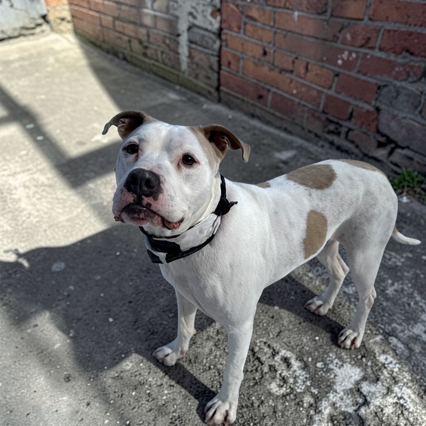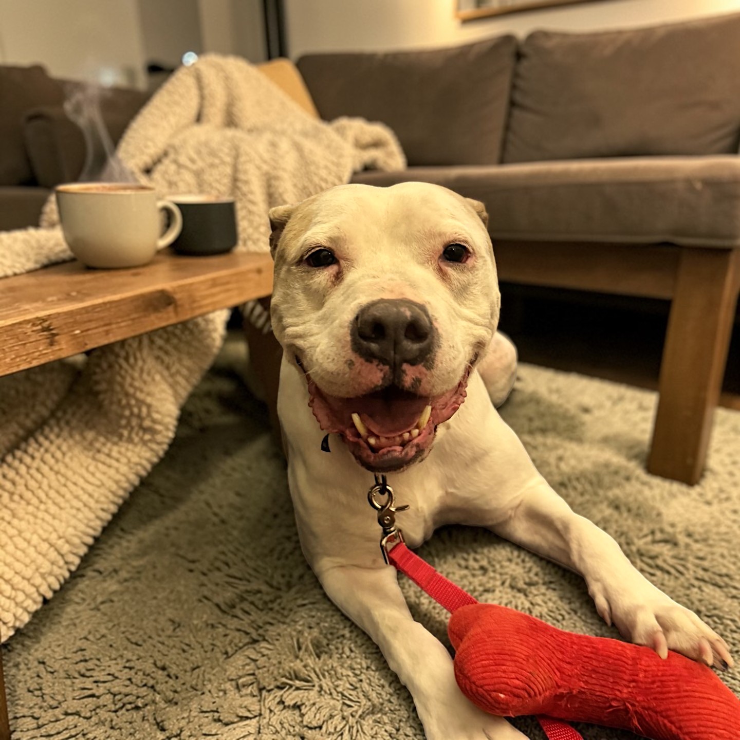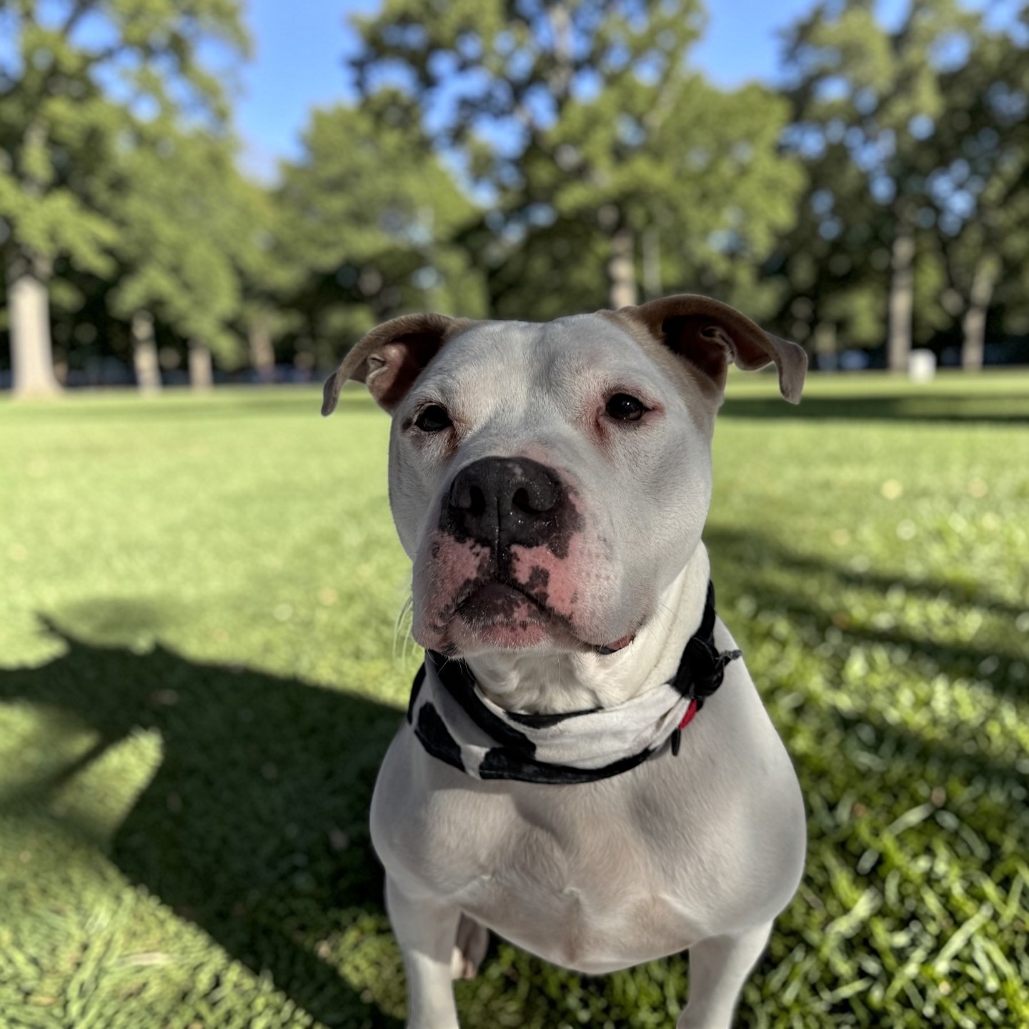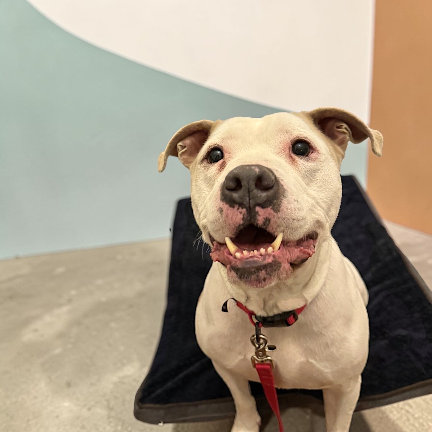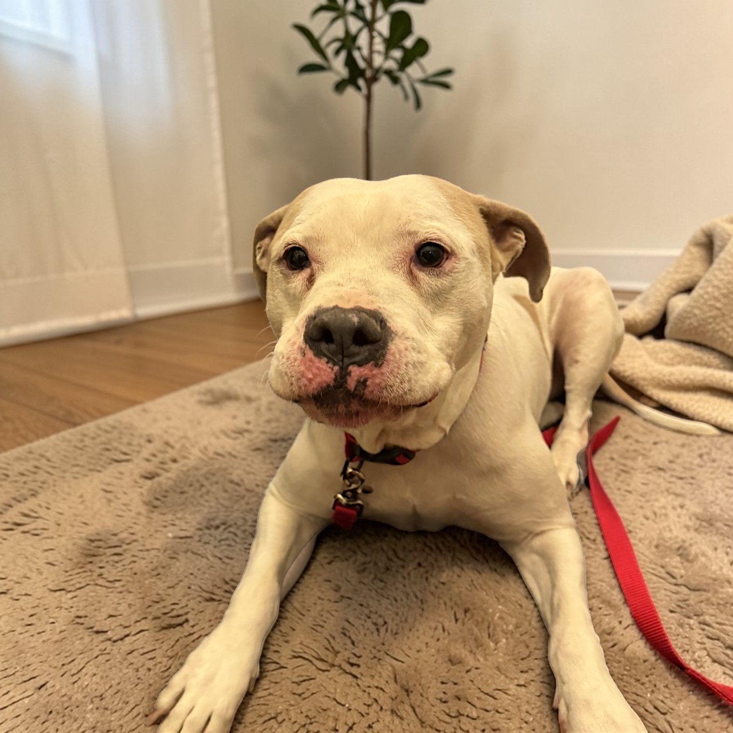 While he does well with other dogs, Angus would also be a great fit for an apartment or quieter home because of his lower energy level. He walks on a leash but will need a strong handler—not because he’s misbehaved, but because he doesn’t quite realize his own strength! Angus weighs about 66 pounds.