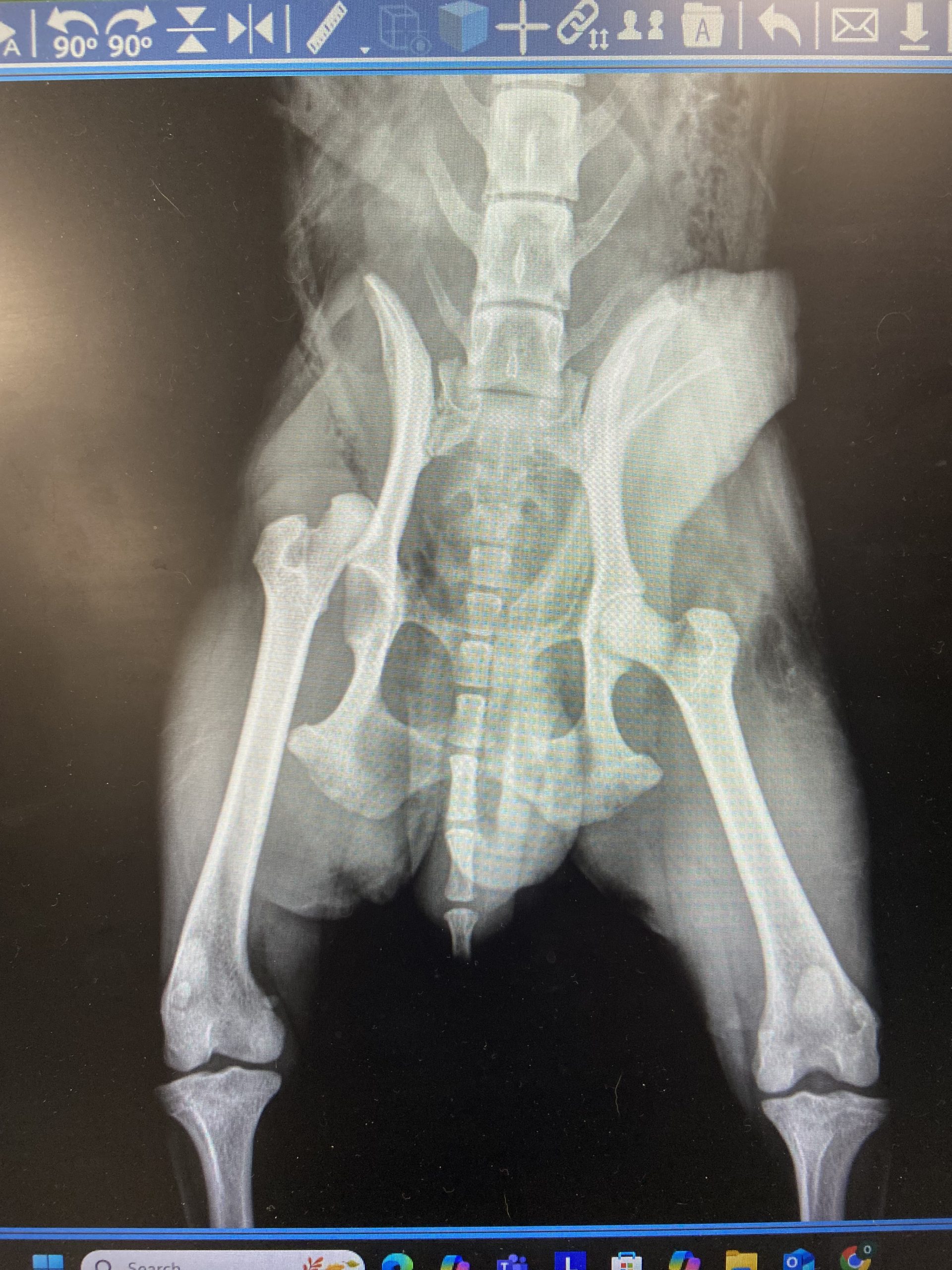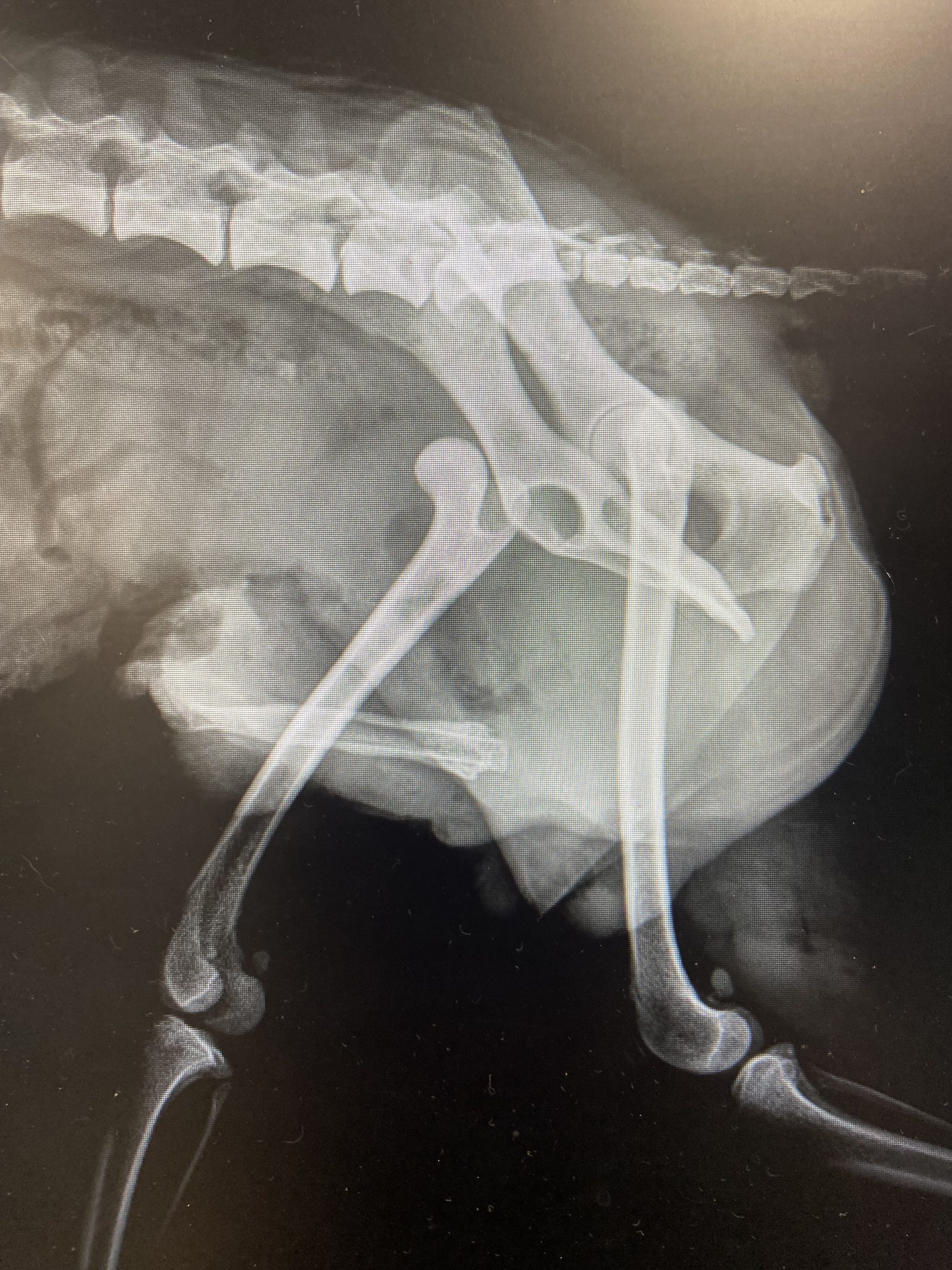 He arrived with severe abdominal trauma (his stomach had been split open) and a fractured femoral head that will require an FHO surgery.