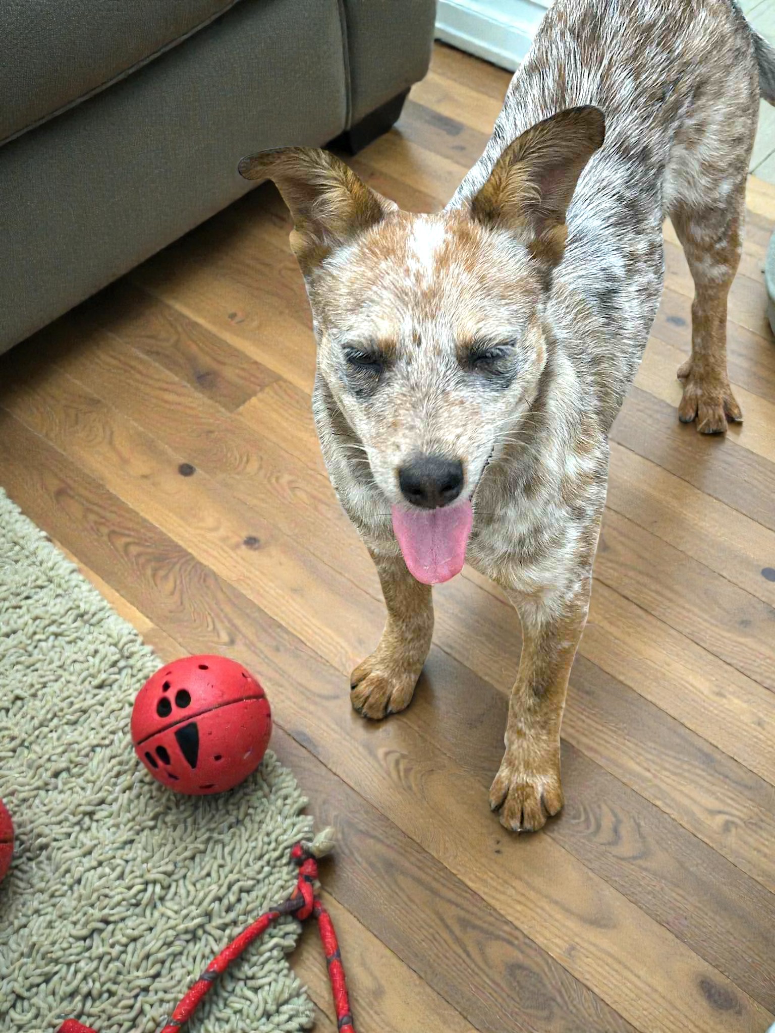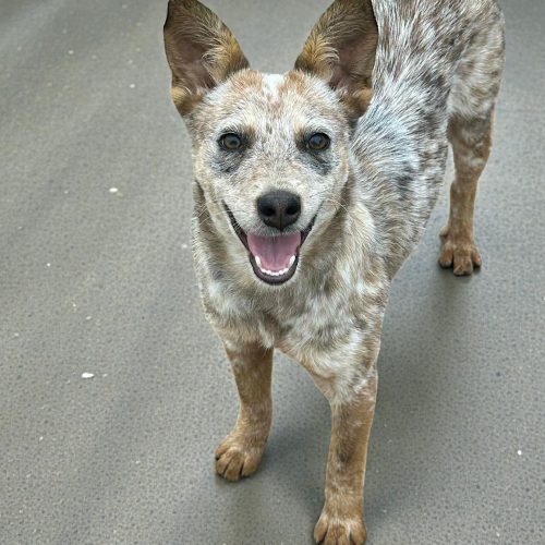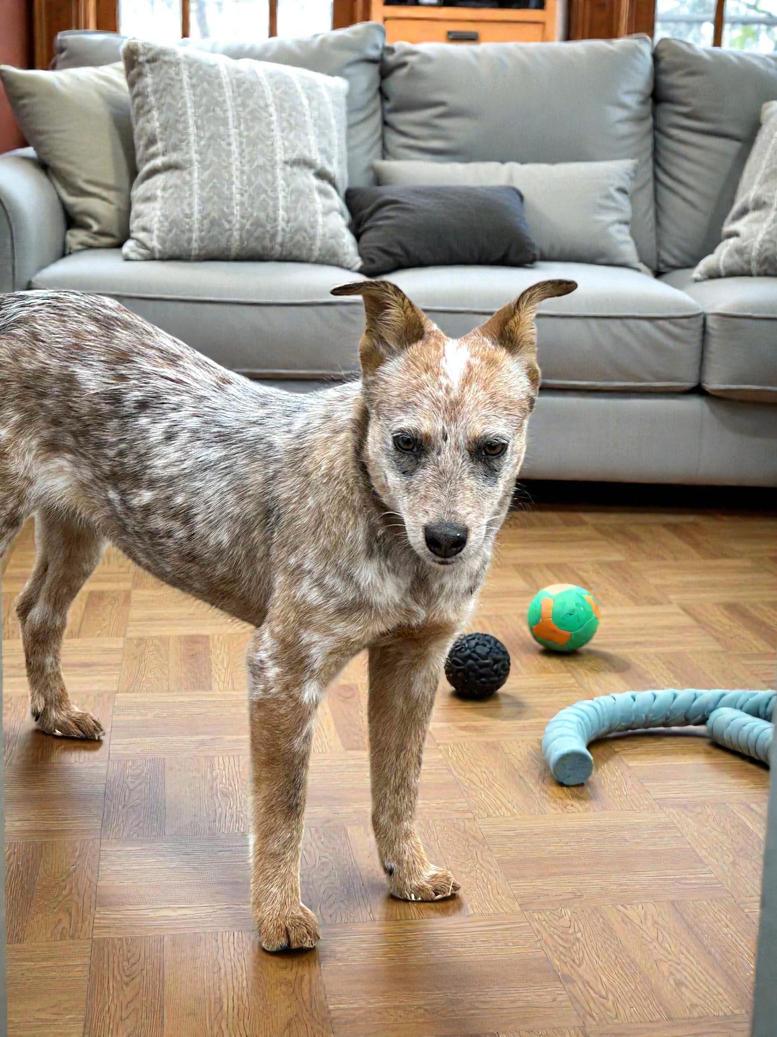 Ember needs a home with another established adult dog to help guide her as she grows and to help burn off that classic heeler energy. She also loves to be held, sleeps quietly in her kennel, and is truly a sweet, gentle pup at heart. A fenced yard is a must for her.