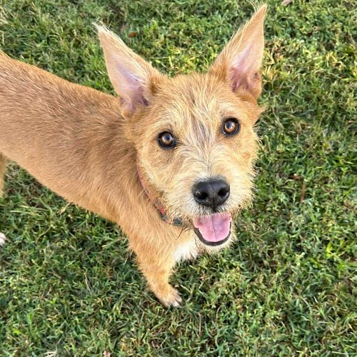 Maisey loves other dogs, does wonderfully with children, and at just 33 pounds she’s the perfect “happy medium.” She is also young with an estimated birthday of October 25, 2024., making her young but not puppy-puppy young!